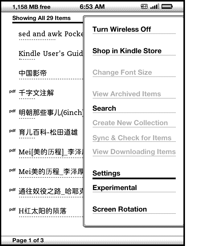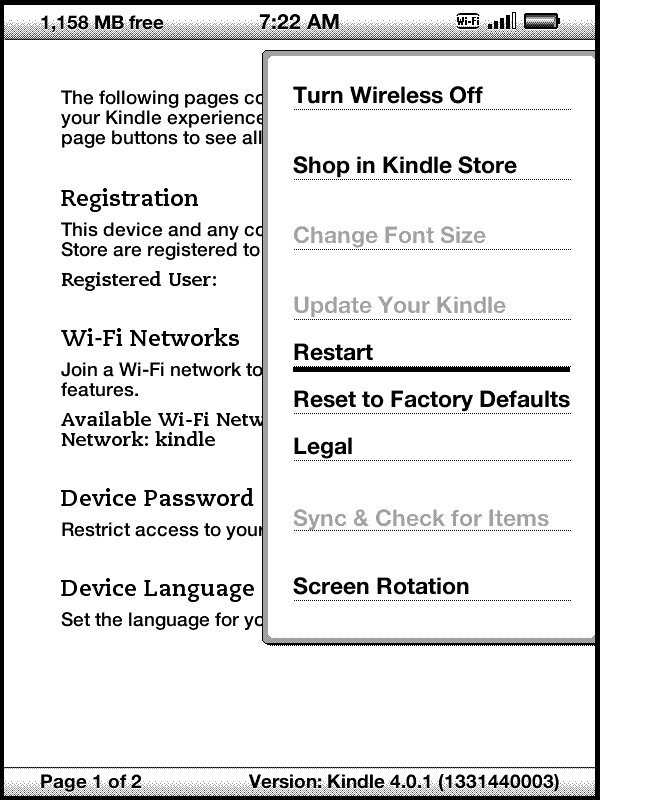 - Restart your Kindle 4: Go to home screen, press menu button, select “Settings”, press menu button, select “Restart” img-001