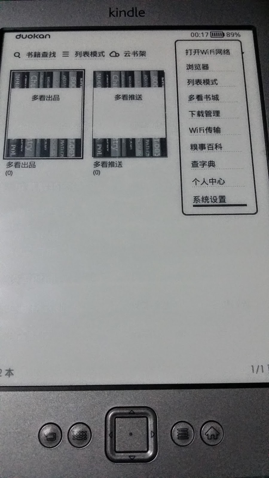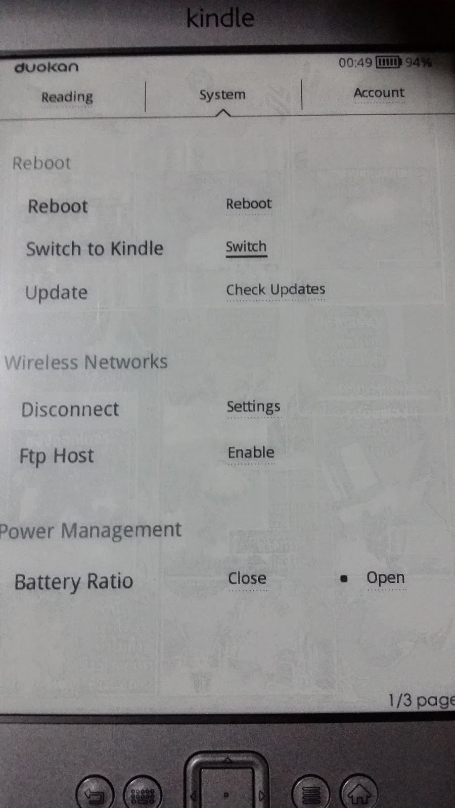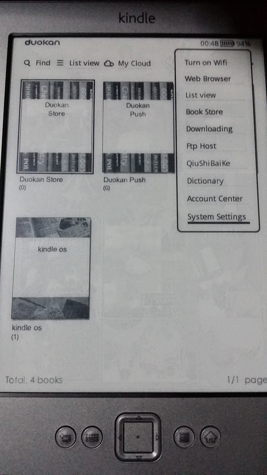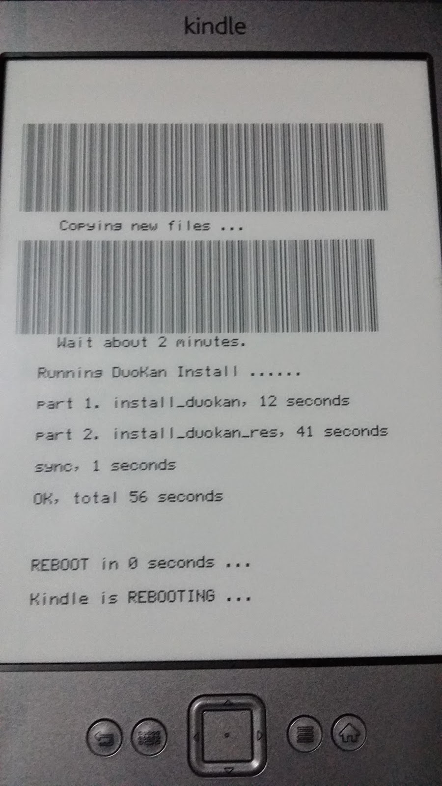- After rebooting, your Kindle should allow you to chose between Duokan and Kindle mode. Pick Duokan mode by pressing the leftmost button on your Kindle 4.